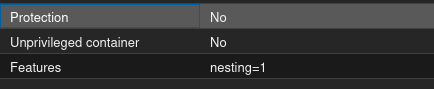 Poszedłem na skróty i postanowiłem ten kontener LXC w Proxmoxie uruchomić testowo z wyłączonymi kagańcami. W Proxmoxie te parametry zostały przestawione na zrzucenie kagańców