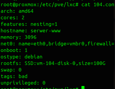 Na tym etapie sprawdziłem, czy mam wjazd z poziomu CLI Proxmox do katalogów kontenera LXC. Sprawdziłem zatem w katalogu cd /etc/pve/lxc/ zawartość pliku związanego z kontenerem LXC: