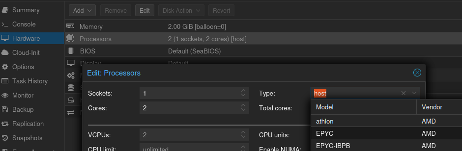W tym miejscu utworzyłem nową maszynę wirtualną, nadałem jej ten sam adres IP, co poprzedniemu kontenerowi LXC i zainstalowałem za pomocą tego złotego skryptu świeżego i pachnącego Dockera. Oczywiście jeszcze konfiguracja SSH, klucze, passwordless, systemctl restart, statyczne IP i wio. A, no i zmiana typu CPU na Host. To rozwiązuje kilka problemów.