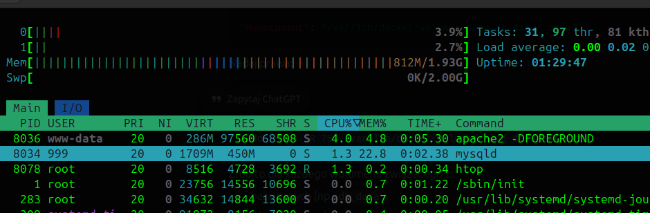 W htop zauważyłem, że Docker usilnie uruchamia proces bazy danych z Usera 999: