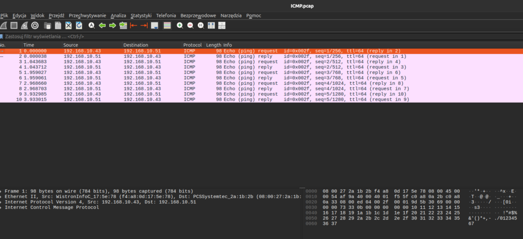 Naszym oczom ukaże się las lista pakietów. Pamiętasz, co mówiłem o filtrach? One pozwoliły nam zapisać tylko ICMP, bez dodatkowych śmieci. Wspaniałe narzędzie.