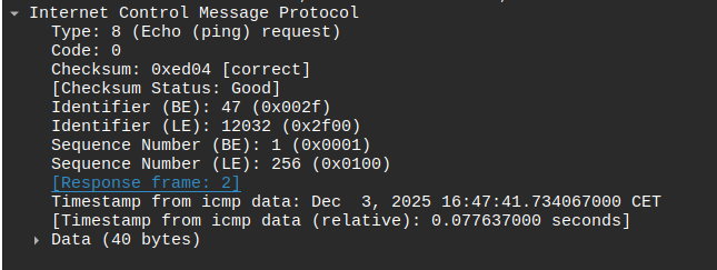 To jest to miejsce, gdzie ICMP jest sobą i są o nim zawarte informacje: co jest badane (typ pakietu, 8). Wysyłamy pakiet ICMP typu 8 (przyjrzyj się kilka linijek powyżej, gdzie odsyłam do dokumentu na ten temat) i oczekujemy, że badany host odpowie nam typem 0. Można wpłynąć na to zachowanie, wyłączając odpowiedzi na ICMP, blokując to za pomocą firewalla, ale w naszym przypadku mamy zwykły, generyczny… przypadek.