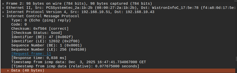 Źródło z celem się zamieniły miejscami (bo wszak ma odpowiedzieć temu, kto pytał, nie?), a pakiet którym odpowiadamy, to ICMP typ 0. Czyli „jestem online, żyję”.