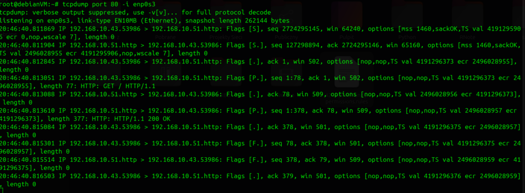 Czekaj, jaki port? Otóż wskazujemy, że tcpdump ma słuchać wyłącznie ruchu na porcie 80, na interfejsie enp0s3 i tak dalej… Filtrowanie, pamiętasz?