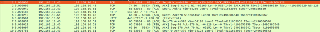 W pierwszej fazie następuje nawiązanie ruchu TCP. W ramach tego transmisja ma potwierdzenia prawidłowości danych, ma się pewność, że dane nie uciekły w trakcie transmisji. Nuda i chwilowo nie interesuje nas to w szczegółach, wystarczy nam informacja, że transmisja była zarówno ze strony komputera, jak i serwera. Skierujmy teraz wzrok na pierwszy z pakietów HTTP.
