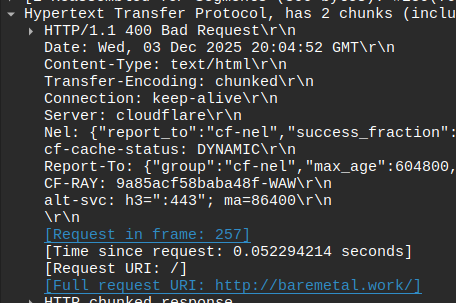Nie dość, że w payload (ostatnia sekcja) widać całego HTML, to serwer się wygaduje, jaka aplikacja i system mieszkają na nim. Ale! Druga linijka screenshota: HTTP/1.1 200 OK. Właśnie wykazaliśmy, że serwer odpowiedział kodem 200 i całość działa jak trzeba. A co, jeśli zapytamy się o coś, co nie istnieje? Spróbowałem zapytać się o http://baremetal.work, co nie powinno się udać, bo witryna jest dostępna jedynie poprzez HTTPS. A proszę:
