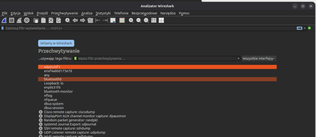 Na samym początku, aby oswoić się z instytucją podglądania pakietów, polecam skupić się na Wireshark. Jest to narzędzie HUI GUI, przez co może być trochę wygodniejsze. Przy starcie pozwala także wybrać podsłuchiwany interfejs:
