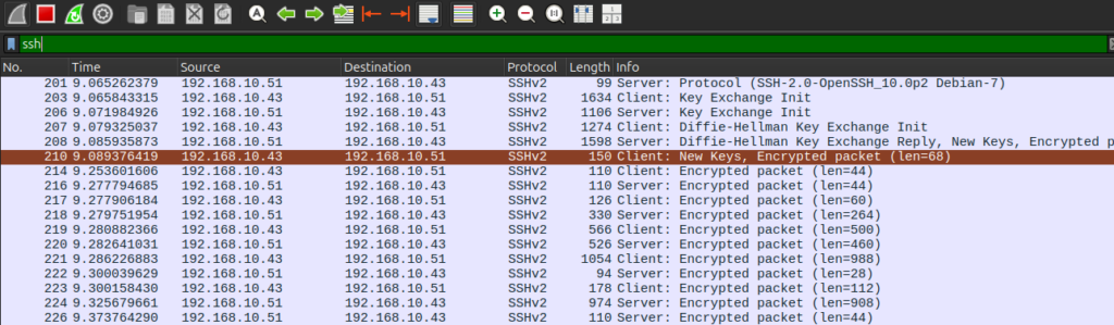 Na liście zobaczysz nie tylko listę swoich kart sieciowych, ale kilku innych urządzeń. Część z nich może wyglądać dziwnie na początku. Jeśli używasz VPN, to go tutaj także zobaczysz, podobnie jak VLAN. Sam Wireshark jest już bardzo potężnym narzędziem, a w połączeniu z tcpdump to potężny oręż w rękach doświadczonego hakera administratora. W większości przypadków będziesz mieć informację, na jakim interfejsie (a przynajmniej na jakim adresie IP) działa jakaś usługa. Nic nie stoi na przeszkodzie, aby słuchać wszystkiego i odpowiednio to filtrować. A właśnie, Wireshark ma też świetny filtr, gdybyś na żywo chciał coś łowić, albo wyłuskać coś z zapisanego już ruchu. Proszę, SSH na żywo: